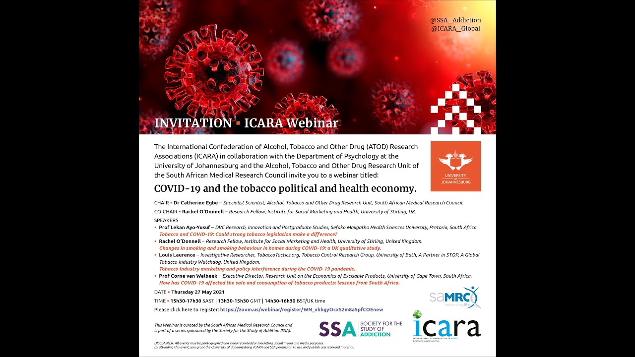 - Agaku I, Egbe C.O., Ayo-Yusuf O.A. (2021). Circumvention of COVID-19-related restrictions on tobacco sales by the e-cigarette industry in South Africa and comparative analyses of e-cigarette vs cigarette volume sales during 2018-2020. Preventive Medicine. 148: 106526. https://doi.org/10.1016/j.ypmed.2021.106526